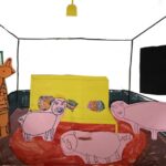 — J’ai une autre idée, ajoute l’un des cochons. On pourrait peindre aussi une louve qui tend ses bras au loup pour lui faire un câlin.
