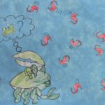 Il regarde les crevettes gigoter dans tous les sens. La grenouille, elle, a des pattes palmées et peut sauter partout avec. Mais les crevettes n’en ont pas et en plus, elles font la java, les coquines ! Elles n’écoutent rien du tout !