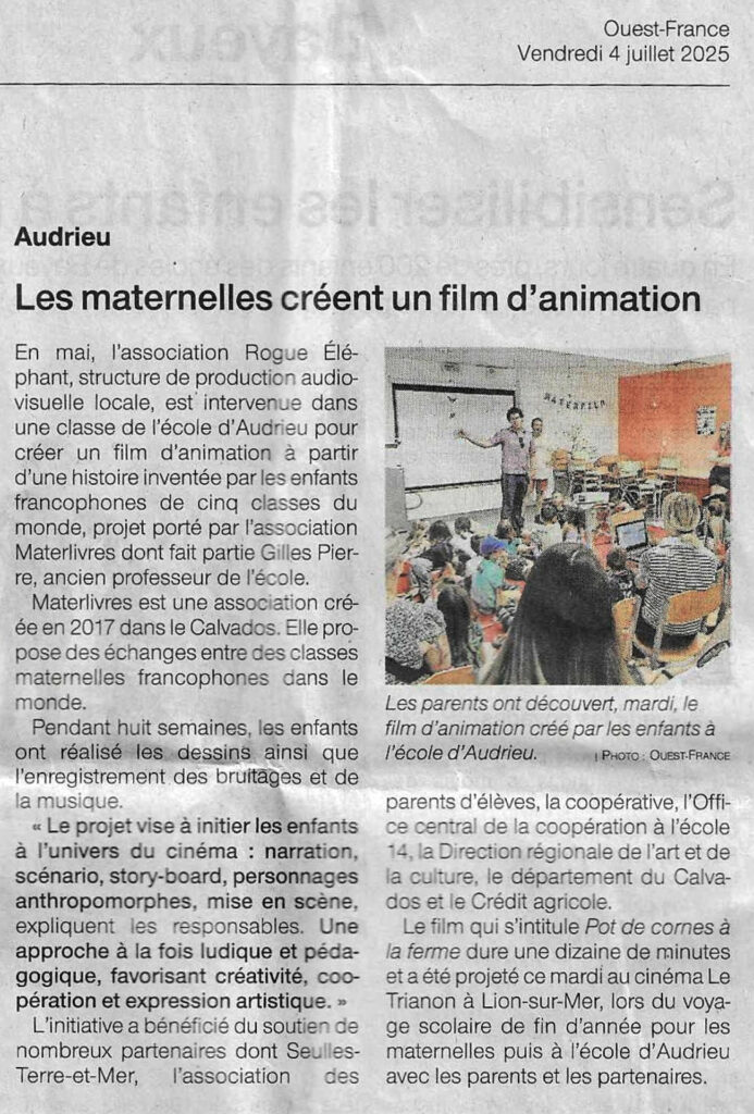 - Article Ouest-France publié le 4 juillet 2025, sortie du film « Pot de cornes à la ferme », produit Materfilm 2025 (cliquer pour agrandir)