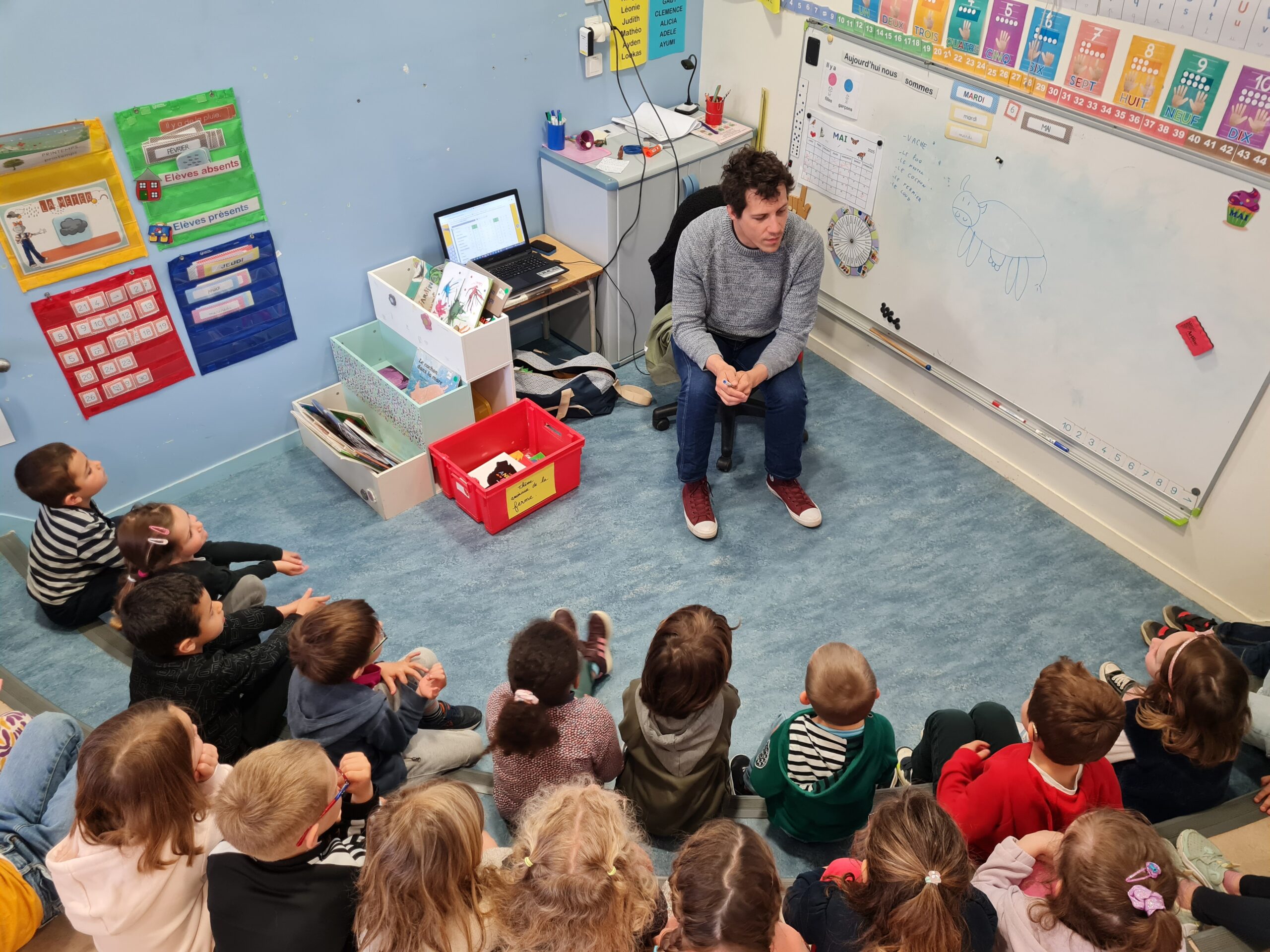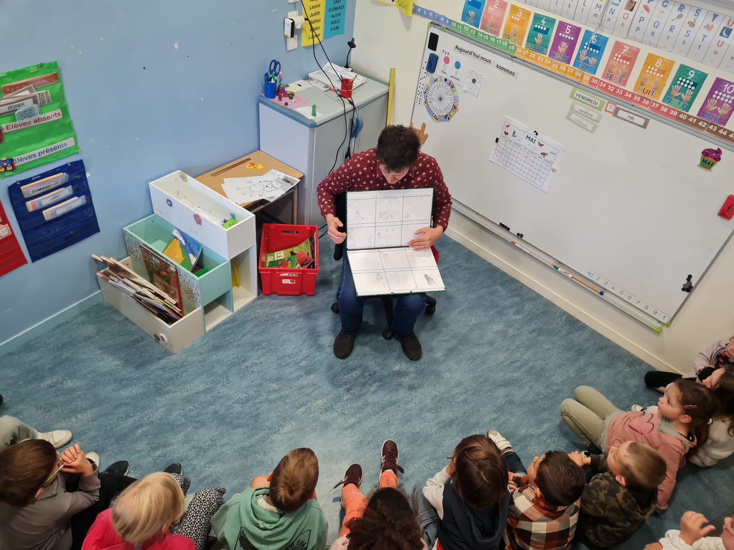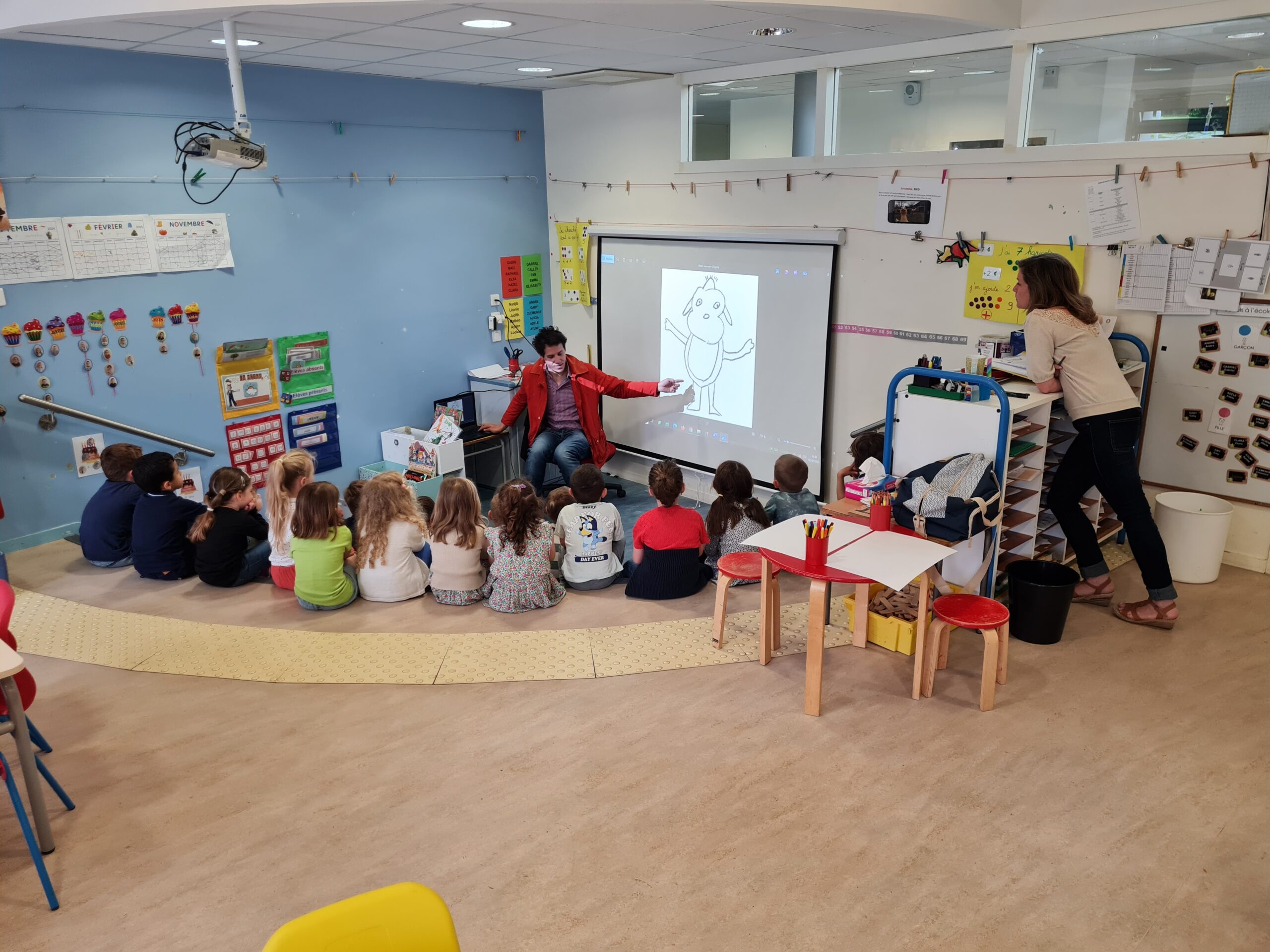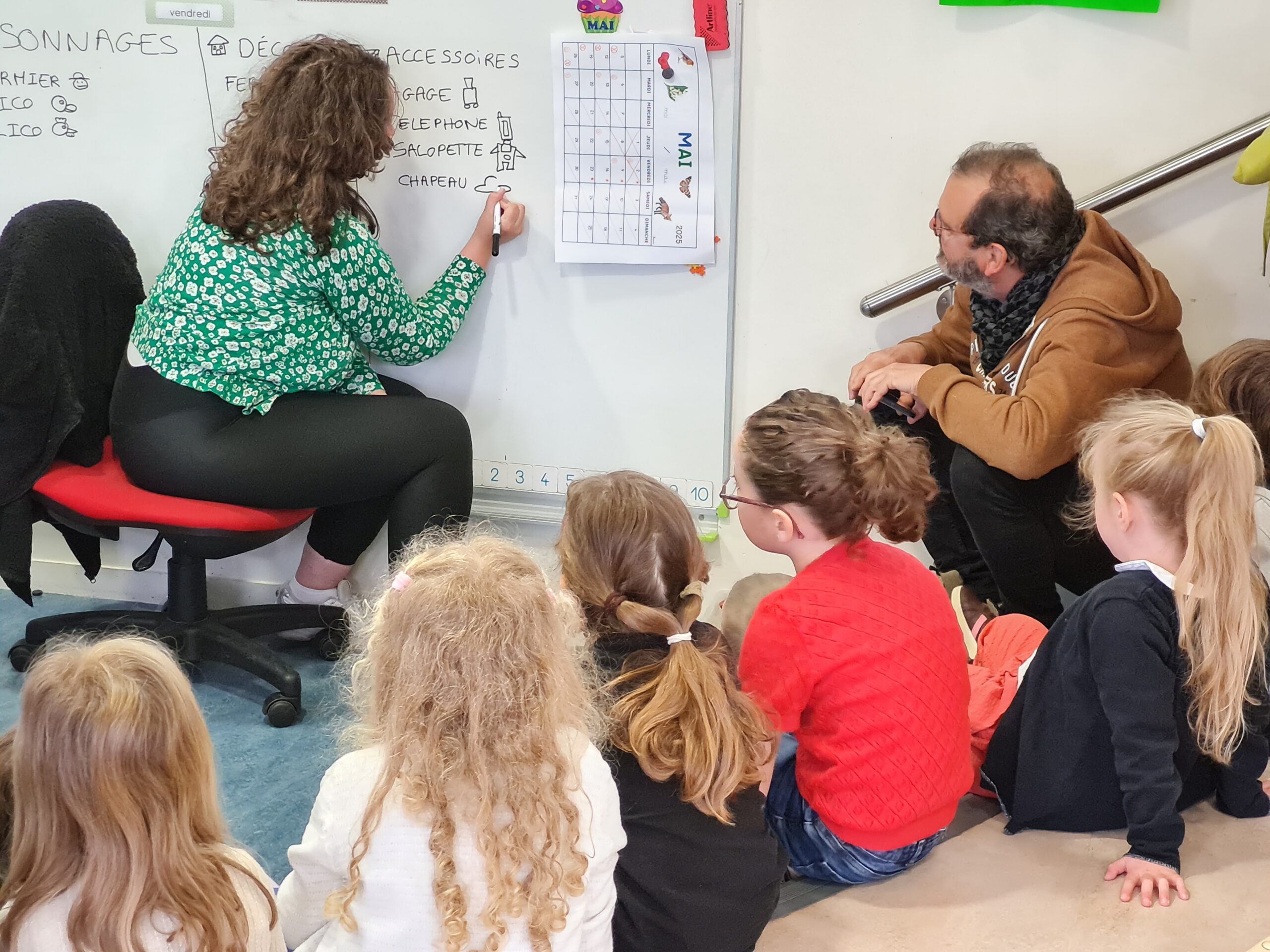 2. L’histoire est relue collectivement pour repérer les personnages, décors et accessoires nécessaires au film ; Ils sont noté au tableau et individualisés avec un dessin