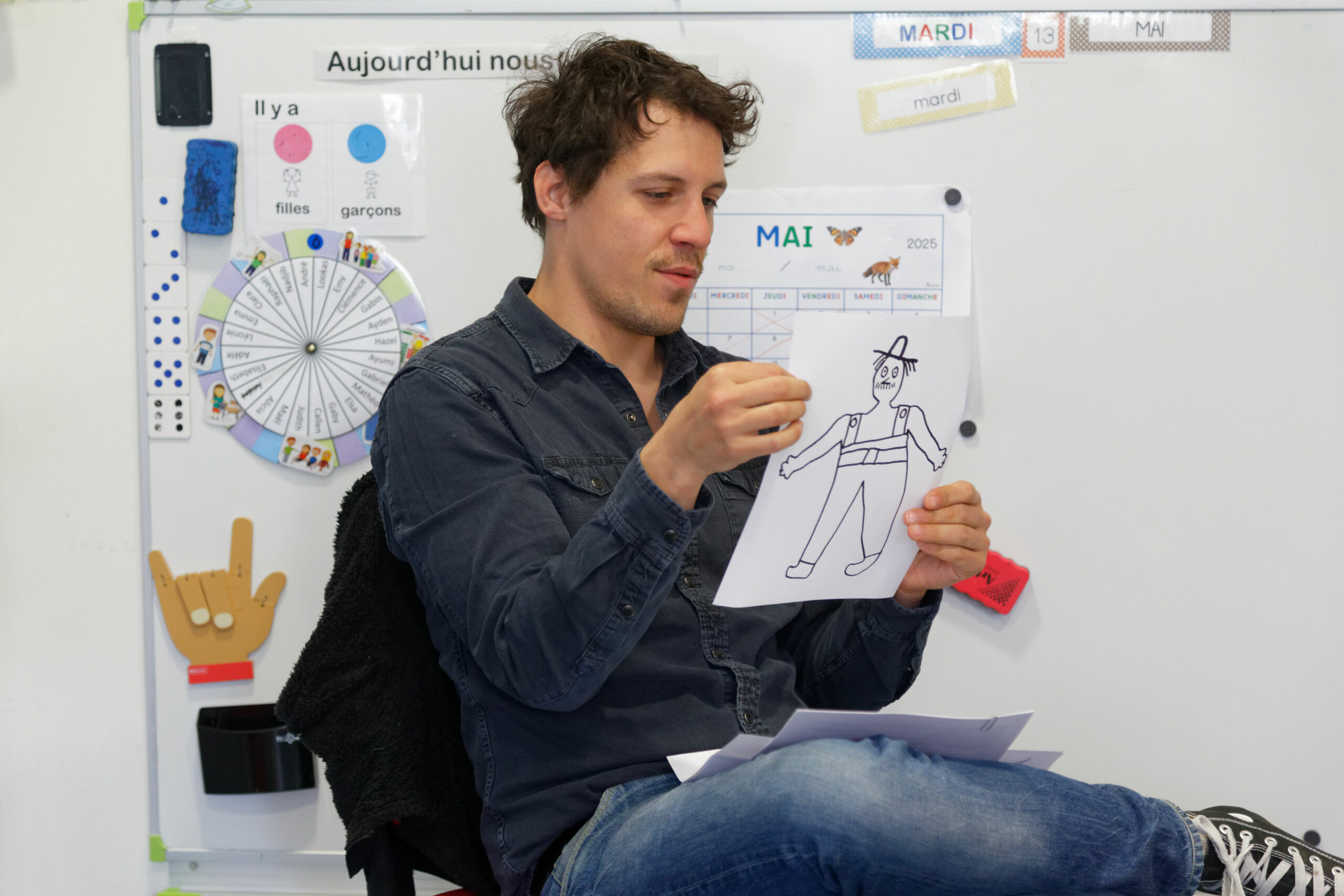 4. Dessin sur A3 des personnages à partir d’un exemple dessiné par un membre de l’équipe au tableau